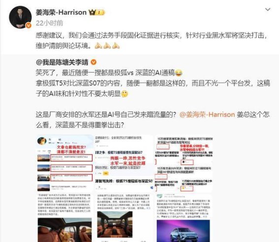 这场风波的源头,正是深蓝汽车CEO姜海荣转发的一条动态。该动态来源于社交媒体账号“我是陈塘关李靖”,大致为对比极狐T5与深蓝S07的测评。该账号在文中质疑:“这些到底是厂家安排的水军,还是AI号自动生成的?难道是为了蹭流量?”姜海荣对此评论称:“感谢建议,我们会通过法务手段进行证据保全,针对行业中的‘黑水军’将进行坚决打击,确保舆论环境清朗。”