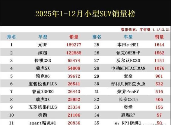 随着2025年1-12月小型SUV零售量排行榜的出炉,整个市场格局发生了显著变化,新能源车型成为了市场增长的主要驱动力,尤其是自主品牌凭借着精准的市场洞察与技术创新,迅速占领了这一细分市场的大部分份额。根据榜单的数据显示,在共计47款车型中,全年总销量突破了60万辆,而新能源车型的元UP则蝉联销量冠军,缤越、传祺GS3等燃油车紧随其后,展现出持续的市场活力。