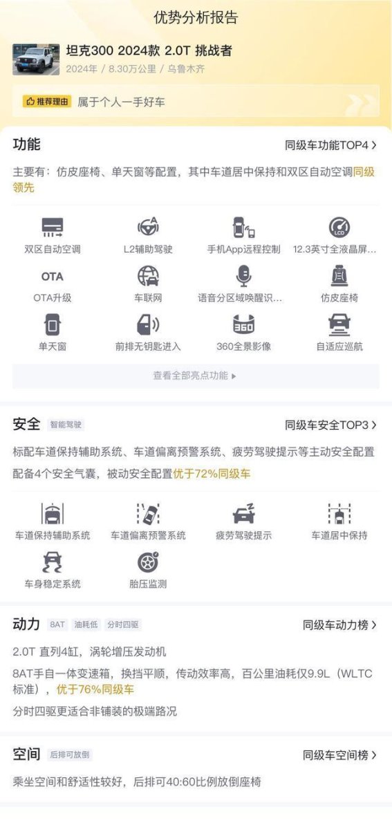 综合来看,坦克300 2024款 2.0T挑战者作为一款硬派越野车,无论是在动力性能、安全配置,还是车内舒适性和科技感方面,都展现了强大的优势。对于热衷越野的消费者而言,它无疑是一款非常值得考虑的车型。虽然它的油耗略高,但如果你的购车预算充足,且对越野性能有较高需求,那么这款车无疑是一款非常值得投资的选择。