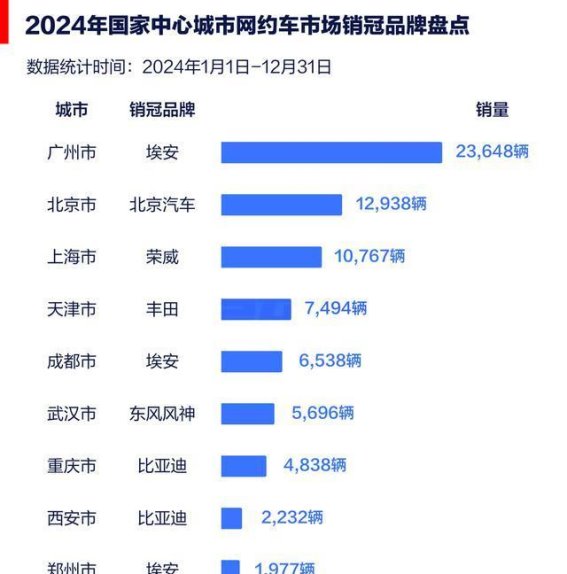 在这一过程中,广州、成都、郑州等多个城市成为了国产新能源汽车的重要阵地。尤其是埃安系列车型,凭借其优异的性能和较低的运营成本,成为了这些城市网约车市场的销量冠军。数据显示,广州市场埃安车型的销量已达到23648辆,成为销量最高的车型。埃安不仅能够在长时间的运营中保持良好的性能,还为乘客提供了宽敞舒适的车内空间和安静平稳的乘坐体验,深得司机与乘客的青睐。