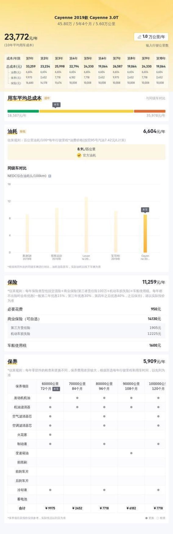目前,市场上这款Cayenne的售价区间大致在46.6万元至58.22万元之间,具体价格会依据车辆的实际状况有所浮动。相比于全新车价格接近100万元,二手车市场中的这款Cayenne以45.8万元的价格出售,无疑具有相当高的性价比。根据估算,这款车的年均用车成本大约为2.4万元。虽然与一般家用车相比略高,但考虑到其豪华品牌的定位和高性能表现,这个费用在豪华SUV中算是较为合理的。