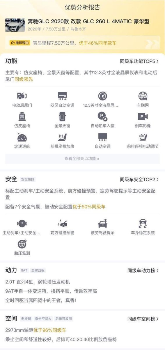 在二手市场的表现上,这款车也极具竞争力。奔驰GLC 2020款 GLC 260 L 4MATIC 豪华型的车主普遍偏向追求品质生活和高性能车辆,二手车的市场需求依然强劲。目前,这款二手车的市场价格约为21.98万元,相较于新车的42.28万元,价格下跌幅度较大,但依然保持着较高的价值。这款车的行驶里程为7.5万公里,且经过了两次过户,整体车况保持良好。在了解车况和进行详细检查后,购买这款二手奔驰GLC将是一个性价比极高的选择,特别是对于那些想要享受奔驰品牌豪华体验的消费者而言。