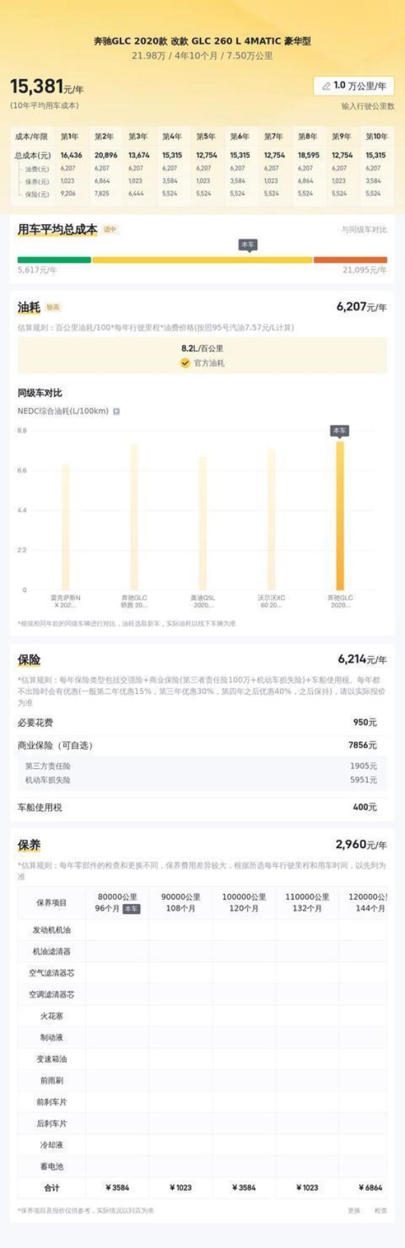 值得注意的是,奔驰GLC 2020款 GLC 260 L 4MATIC 豪华型的用车成本相对较高。根据数据统计,10年平均用车成本约为14705元/年。相比其他同级别的SUV,奔驰GLC的用车成本处于中高水平。这主要与其强劲的2.0T发动机和较高的燃油消耗相关。豪华车型的保养费用和维修费用也相对较高,因此购买者在选择这款车时,需充分考虑到长期的用车开销。若车主注重的是车辆的品质与性能,且有一定的经济基础,那么这部分额外支出无疑是值得的。