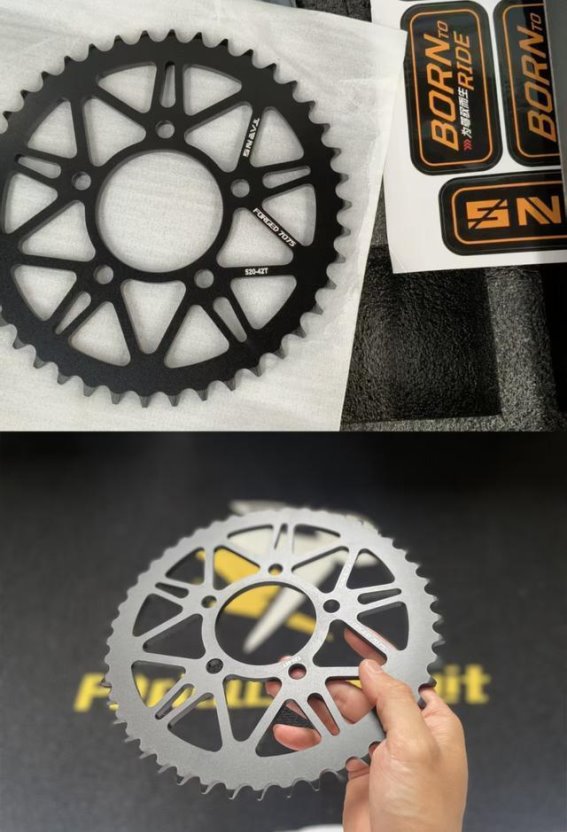 在钛斯的产品升级中,7075-T6锻造牙盘的应用尤为引人注目。作为高强度锻造铝合金材质,7075-T6在摩托车配件中具有广泛的应用前景,尤其是在牙盘领域。钛斯此次推出的多规格牙盘,从38齿到58齿都有提供,不仅能够满足不同赛道、不同道路条件下的需求,还在极大减轻了簧下重量的提升了车辆的操控性能。举例来说,标准的415-42牙盘,重量仅为150g,几乎与两个鸡蛋的重量相当,令摩托车的整体重量大幅降低,提升了骑行的灵活性与舒适性。