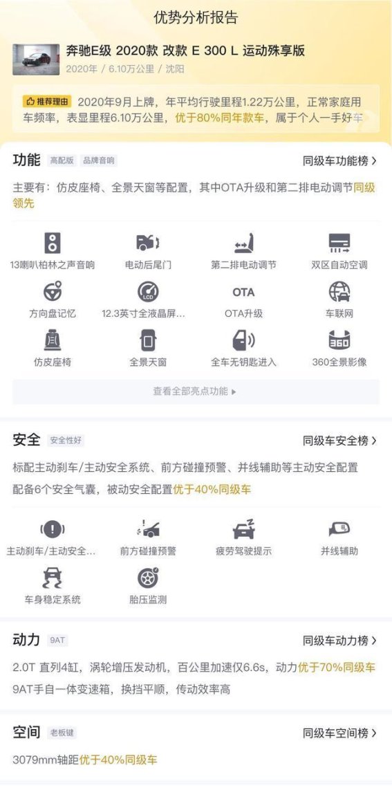 这款2020款奔驰E 300 L运动殊享版的车源来自沈阳,首次上牌时间为2020年9月。至今,这辆车的行驶里程为6.1万公里,属于汽车使用的正常范围。更为难得的是,这辆车从新车到现在一直由一个车主拥有,且没有过户记录。对于二手车而言,这意味着车辆的保养记录清晰,车况得到了较好的维护。