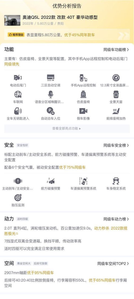 奥迪Q5L,自从2018年推出以来,凭借其精致的外观和强劲的动力,一直深受消费者喜爱。作为Q5的长轴距版本,Q5L不仅拥有更大的车内空间,还提供了更加舒适的驾乘体验。今天,我们将带您了解一辆二手奥迪Q5L,它凭借5.8万公里的低里程和出色的车况,成为了市场上非常吸引人的选择。
