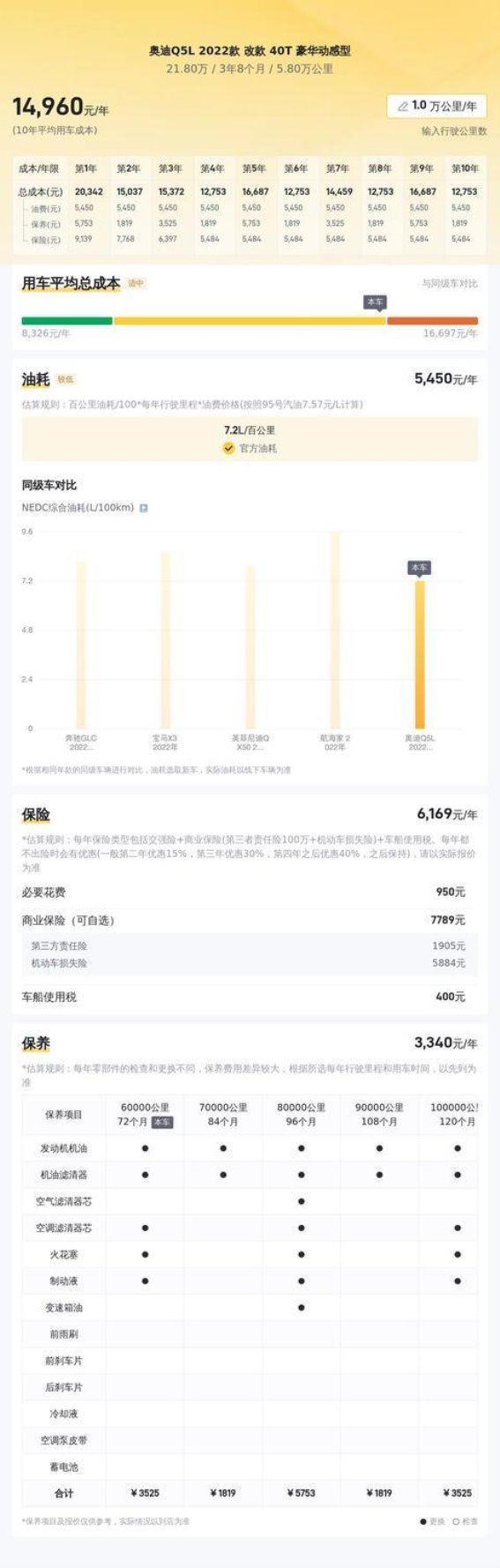 奥迪Q5L的用车成本对于大多数消费者来说是一个重要的关注点。根据统计,这辆车的年均用车成本大约为1.5万元。虽然相对于一些普通品牌车型,这个成本略高,但考虑到奥迪Q5L作为一款豪华SUV的定位,其用车成本还是较为合理的。若您能够妥善保养车辆,合理控制油耗和维修费用,那么这款车的综合成本将会更加适中。
