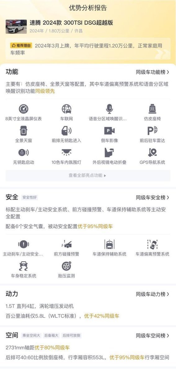 速腾2024款300TSI DSG超越版的最大优势在于其出色的性价比和全面的配置。10万元的价格远低于市场行情,且配备了丰富的智能化和安全配置,能够为车主提供全方位的保障。1.5T发动机的动力表现非常符合日常家庭用车的需求,车内空间宽敞舒适,驾驶体验也十分流畅。