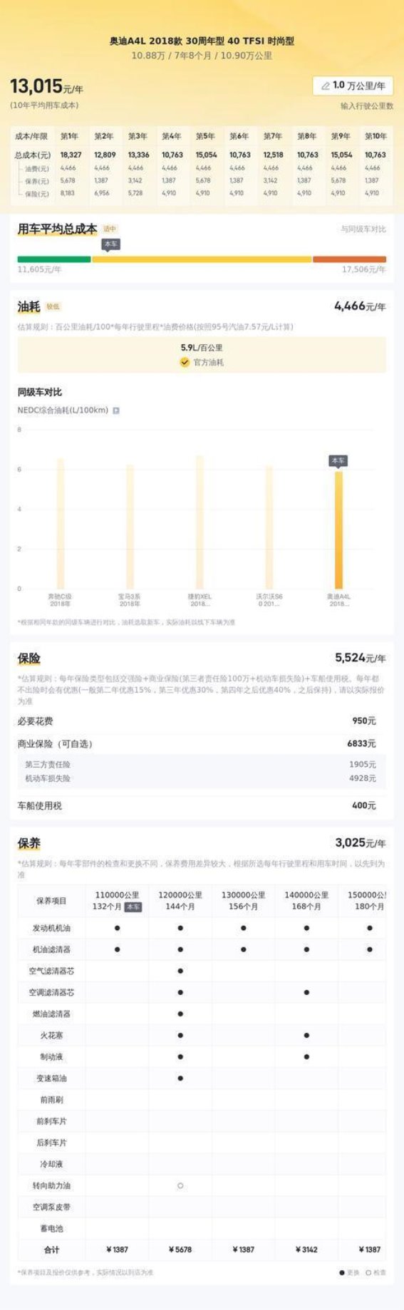 从市场行情来看,同款二手A4L的价格在11.65万至14.18万元之间,价格差异主要取决于车辆车况。用车成本方面,官方百公里油耗为5.9L,按年行驶一万公里计算,燃油费用约5014元;年度商业保险约4759元,每年保养费用约3061元,综合年度用车成本约12834元。实际开销会随驾驶习惯和车辆使用情况有所不同,但整体经济性仍然可控,对于追求豪华与实用兼备的消费者而言,这款车具备较高吸引力。