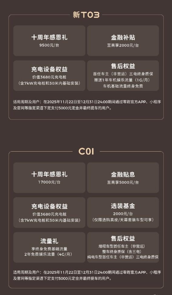 零跑在12月推出的购车权益,不仅涵盖了多款车型,还提供了丰富的现金优惠、金融补贴、赠品和换购福利。无论是首次购车还是老车换新,消费者都能在这些优惠政策中找到适合自己的车型。这一系列福利措施不仅让消费者感受到零跑品牌的真诚与厚意,也为年底的购车热潮增添了不少火热的气氛。在这个促销季,零跑通过这一波优惠活动,为消费者提供了更多的选择,也进一步巩固了其在市场上的竞争力。
