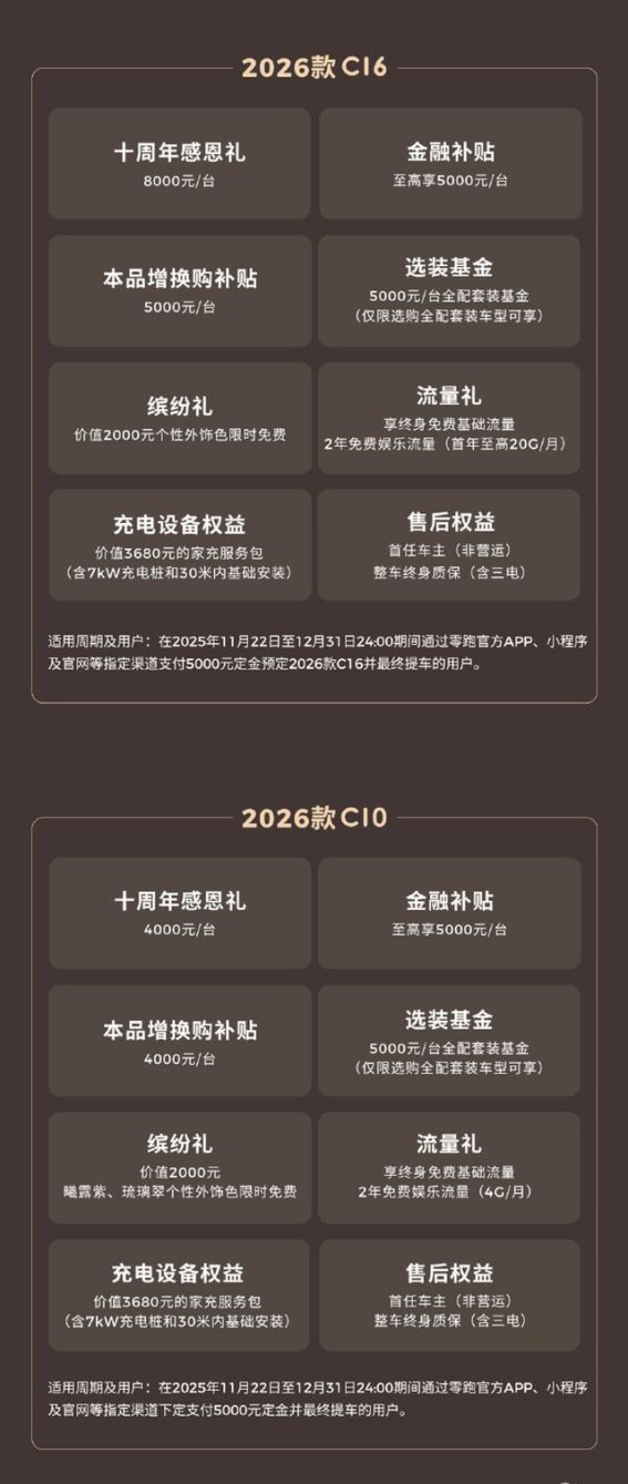 对于全新C11、2026款C16及C10等车型,零跑同样推出了多个惊喜优惠。全新C11提供6000元的十周年感恩礼,并附赠至高5000元的金融补贴和5000元的增换购补贴。而2026款C16在提供8000元现金优惠的基础上,还赠送了5000元的金融补贴和5000元的选装基金,配合个性外饰色的限时免费赠送,进一步提升了消费者的购车价值。2026款C10也不遑多让,提供4000元现金优惠,搭配至高5000元的金融补贴和4000元的本品增换购补贴,成为了一款性价比极高的家用车选择。