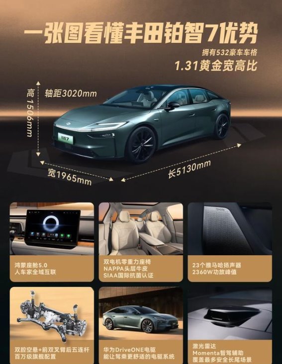 外观设计上,铂智7延续了丰田家族标志性的“锤头鲨”前脸,严格遵循豪车常用的1.3黄金宽高比,呈现出浑然天成的视觉比例。前脸造型饱满而有力量,灯组设计锐利且富有科技感,配合镀铬装饰,整车显得大气而不张扬。侧面超大的后三角窗设计和纯平侧窗,使车身线条流畅优雅,视觉延展感极强。尾部造型低调而厚重,灯组设计与前脸呼应,整体造型协调统一,既保证了高级感,也强化了整车的豪华气场。无论是日常通勤还是高端社交,这样的设计都让车主倍感面子十足。