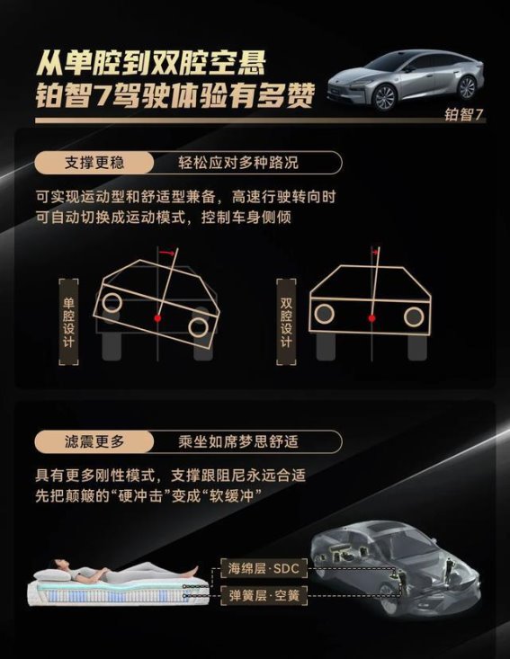 进入车内,铂智7的豪华与舒适感更加凸显。车内配备带腿托的零重力座椅,能够有效分散身体压力,即使长途出行也不会感到疲惫。双腔空气悬挂底盘的加入,让整车在行驶过程中平稳吸收路面震动,无论是高速驾驶还是通过减速带,乘客都能享受到接近静谧舱的舒适体验。每一次乘坐都像是享受VIP待遇,无论是商务接待还是家庭出行,乘客都能体会到尊贵感和舒适度的双重体验,让铂智7在豪华与实用之间找到了完美平衡。