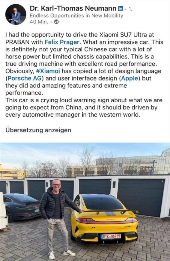 近日,大众中国前CEO卡尔-托马斯·纽曼在试驾小米最新SUV——SU7 Ultra后,在社交平台上分享了自己的感受。他直言,这台车“绝对不是那种马力强但底盘拉垮的典型中国车,而是一台拥有出色道路表现的真正驾驶机器”。纽曼的评价毫不保留,显示出他对这辆车在驾驶体验和性能上的高度认可。作为曾经深度参与全球汽车产业布局的资深管理者,他的言论不仅打破了外界对中国车“堆配置、操控不足”的固有印象,也让人们对小米进军高端汽车市场的能力有了全新的认知。纽曼在试驾中体会到,这不仅是一辆配置丰富的SUV,更是一款在道路表现上能够与国际品牌抗衡的车型,每一次加速、每一次过弯都让人感受到驾驶的纯粹乐趣。