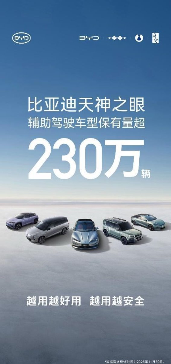 截至2025年11月,比亚迪“天神之眼”辅助驾驶系统的累计装车量突破230万辆,稳居中国市场辅助驾驶系统销量的榜首。这一成绩不仅是比亚迪智能驾驶技术快速发展的体现,也反映出其“全民智驾”战略的成功实施。随着技术的不断发展和市场需求的日益增大,智能驾驶正加速从高端配置向主流市场普及。