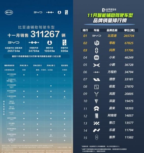 比亚迪近期发布了搭载其“天神之眼”辅助驾驶系统的车型销售数据,显示出这一技术在市场中的强大表现。2025年11月,搭载该系统的车型月销突破31万辆,持续领跑市场,充分展示了比亚迪在智能驾驶领域的领先地位。特别是王朝系列与海洋系列车型的销售表现,贡献了超过26万辆的销量,彰显了比亚迪品牌的强大吸引力。与此方程豹、腾势以及仰望等高端品牌的稳健表现,也为比亚迪在智能驾驶领域的广泛布局提供了有力支持。