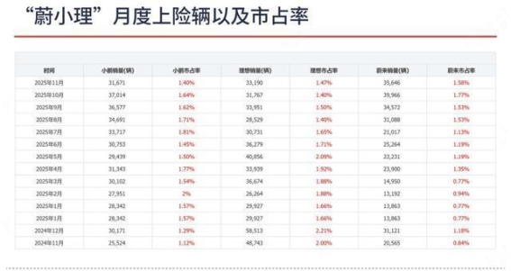 从销量数据来看,2025年11月,“蔚小理”三家交付均未突破4万台。理想交付33181辆,小鹏交付36728辆(含海外市场),蔚来交付36275辆。从市占率变化来看,三家企业均出现不同程度下滑,小鹏结束了自5月以来连续增长的势头,市占率从近一年最高的2%下降到1.4%;理想则跌出2%市占率区间,徘徊在1.5%以下;蔚来虽然在冲击2%市占率,但整体规模并未实现绝对增长。销量停滞在3万台的现象表明,新势力在市场饱和阶段增长动力不足,同时也反映出品牌在稳定用户基础、保持持续增长方面存在挑战。