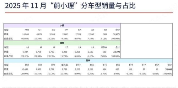 具体到产品结构与销量表现,小鹏的问题在于产品结构失衡及对新车效应过度依赖。数据显示,MONA M03作为价格最低的车型,其销量占比超过四成,而其他车型如G7和全新P7在上市三个月后销量均出现明显下滑,增长缺乏持续性。蔚来则受到车型冗余困扰,11款在售车型中有5款月销量不足千辆,主力车型ES8的新车保护期结束后,后续销量支撑仍存不确定性。理想虽然产品结构相对合理,但增程基盘市场仍在流失,10至11月总销量仅增加两千台,而纯电车型i6、i8两款车型增量已超过两千台,曾经的利润支撑车型L7、L8、L9已难再延续辉煌。这些问题说明,三家新势力在保持既有优势的仍面临市场结构性挑战。