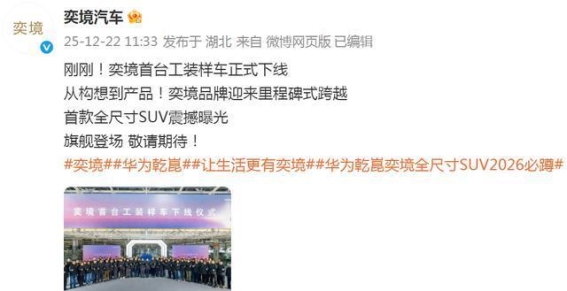12月22日,奕境汽车正式宣布,首台工装样车成功下线,并透露该车型为“全尺寸SUV”。这标志着奕境品牌在汽车行业的一次重要进展,也为未来的智能汽车市场增添了更多期待。作为东风与华为深度合作的全新品牌,奕境首款车型不仅将搭载最前沿的智能技术,还在驾驶体验和车内生态上进行了一系列创新,展现了品牌对于未来汽车发展的深刻洞察。