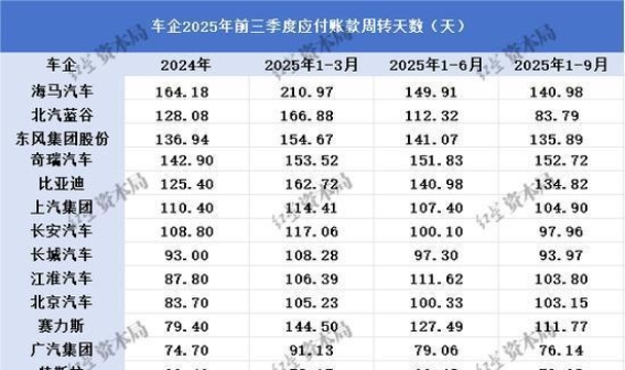 2025年6月10日,多家车企共同发布声明,承诺将供应商的付款账期缩短至不超过60天。此举得到中国汽车工业协会的支持,并在9月发布了《汽车整车企业供应商账款支付规范倡议》,对供应链中的各环节提出了具体的操作建议。从2025年第一季度到第三季度,多个车企的账期确实有所缩短,尤其是北汽蓝谷,其账期周转天数大幅下降了25%。特斯拉、广汽集团等车企也实现了账期压缩,平均应付账款周转天数降低至100天以内。