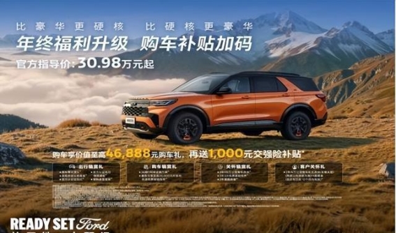 年底购车季已至,福特不仅为消费者提供了更多样化的车型选择,还带来了至高46,888元的购车礼遇。无论是想体验极速驾驭的越野玩家,还是热衷豪华配置的都市精英,福特探险者昆仑谱系都能满足他们对车的全部想象。