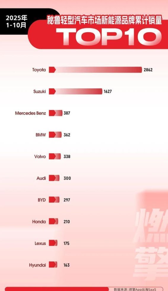 在中国品牌方面,比亚迪无疑是一个亮点。尽管比亚迪的297辆销量相较于丰田和铃木的成绩相差甚远,但它依然是唯一进入秘鲁市场前十的中国新能源品牌。比亚迪的成功标志着中国品牌在秘鲁新能源市场的崭露头角。比亚迪的主力车型是纯电动汽车,而秘鲁市场目前更倾向于选择混动汽车,且充电设施的匮乏使得纯电动车型面临较大挑战。比亚迪及其他中国品牌要想在秘鲁市场获得更好的表现,必须根据当地市场的需求和发展趋势进行产品调整,尤其是要加强混动技术的布局。