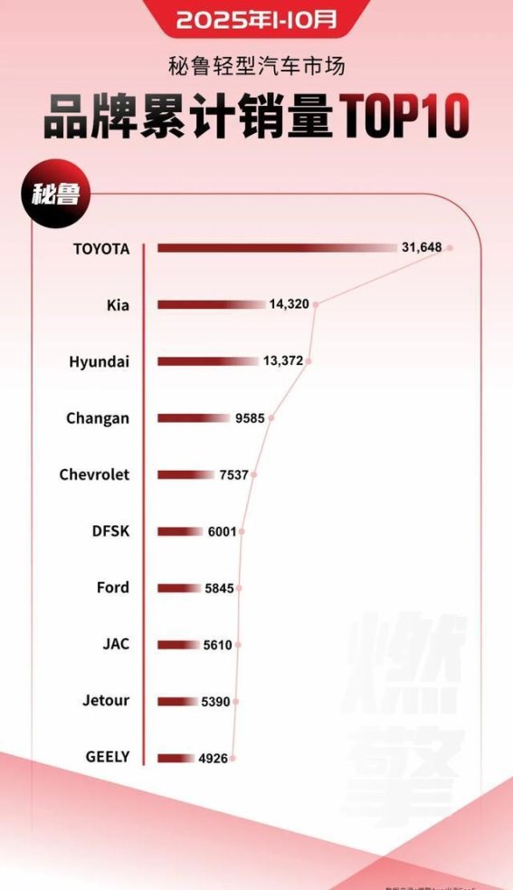 在2025年1月至10月的秘鲁轻型汽车市场中,竞争格局愈发清晰。各大汽车品牌凭借不同的市场定位和产品策略,展现出各自独特的优势。丰田凭借强大的综合实力稳居市场领先地位,而韩系品牌起亚与现代则形成了稳固的第二梯队。与此中国品牌凭借高性价比和多样化的产品布局,逐步在秘鲁市场占据了一席之地,成为不可忽视的力量。