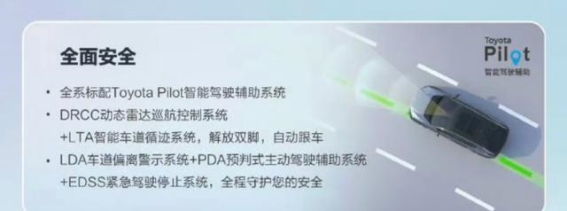 安全性一直是卡罗拉的核心优势之一,全新智混卡罗拉在这一方面强化。新车搭载了最新版本的Toyota Pilot高阶智驾辅助系统,包括车道偏离预警、动态雷达巡航等主动安全功能,能够有效提高驾驶过程中的安全性,尤其是在高速行驶和复杂道路环境下,保障驾驶的平稳和安全。