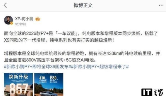 2026款小鹏P7+增程版今日正式亮相,这一次小鹏为用户带来了纯电版和增程版两种选择,展现出在电动轿跑领域的全新突破。纯电版全面升级“857”技术,搭载全系800V高压平台和5C超充AI电池,使CLTC续航里程最高可达725公里,为长途出行提供了强有力的保障。而增程版则以430公里的CLTC纯电续航和1550公里的CLTC综合续航,成为官方口中“全球纯电续航最长的增程轿跑”,展现了在续航能力上的绝对领先优势。小鹏汽车董事长何小鹏在发布会上指出,这一版本的P7+不仅在续航上创新突破,还在动力和智能配置上实现全面升级,真正将增程轿跑的性能潜力发挥到极致。此次发布不仅是对技术实力的展示,也体现了小鹏在新能源智能汽车领域持续深耕和创新的信心。