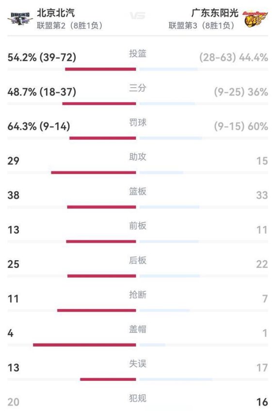 技术统计方面,北汽在各项数据上全面领先。全场投篮命中率54.2%,三分球命中率高达48.7%,而广东仅有44.4%和36%。北汽三分球投中18个,广东仅命中9个,这一项数据北汽就领先27分。北汽在助攻、篮板、抢断和盖帽等方面均占优:助攻29比15,篮板38比33,抢断11比7,盖帽4比1,失误13次较广东的17次略少。这些数据清晰地显示出北汽在攻防两端的全面优势,而广东则陷入全面被动,呈现彻底溃败的局面。