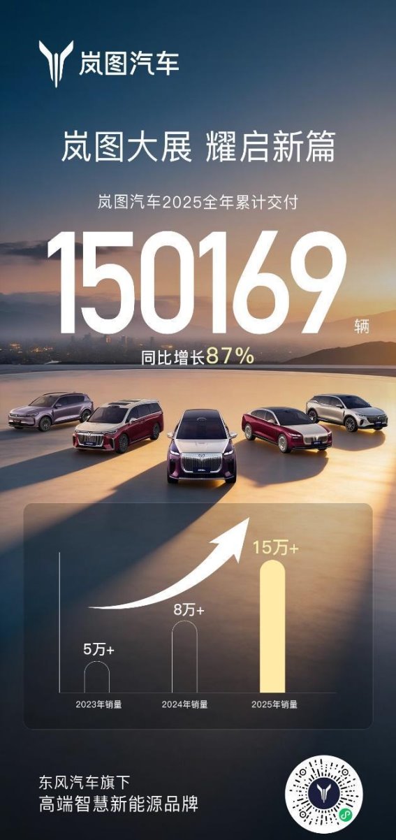 凭借产品领先、技术领先和市场领先的多维驱动,岚图汽车在2025年实现了全面跃升。进入“十五五”时期,岚图将在品牌、产品、技术、服务、渠道及国际市场布局等方面持续进阶,实现新一轮跨越式发展。通过高质量增长,岚图不仅不断提升自身价值,也为中国新能源汽车产业发展注入强劲动力,进一步巩固中国高端新能源品牌在全球的竞争力。