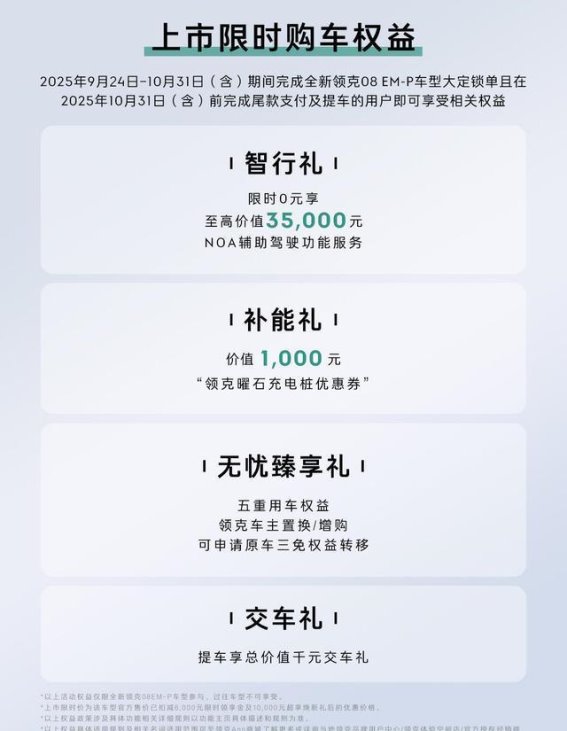 领克此次还推出了诚意十足的1月限时购车福利。2026年1月31日前完成大定锁单、尾款支付及提车的用户,可享受2000元限时红包、8000元购置税补贴、至高8000元感恩礼以及至高15000元选装基金等多重权益,同时叠加“12万2年0息”或“5年贷2年0息”金融方案,以及至高4000元以旧换新补贴,进一步降低购车门槛。购车用户还可获得价值1000元充电桩优惠券及至高35000元的终身免费NOA辅助驾驶服务,让智能驾驶和日常用车体验全面提升。这些福利不仅体现了厂商的诚意,也为潜在消费者提供了切实可见的购车价值。