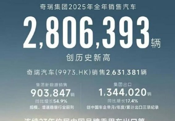 奇瑞集团在2025年的表现,则更多体现出传统车企在转型过程中的厚积薄发。全年总销量达到2806393台,其中新能源销量903847台,同比增长54.9%,同时海外出口达到1344020辆,保持中国汽车品牌出口第一的位置。新能源与出口的双重增长,不仅为奇瑞贡献了稳定且高质量的增量,也在全球市场中持续强化其“技术型品牌”的定位。通过在不同市场之间形成互补,奇瑞正在构建一套更加稳健的全球化发展逻辑。