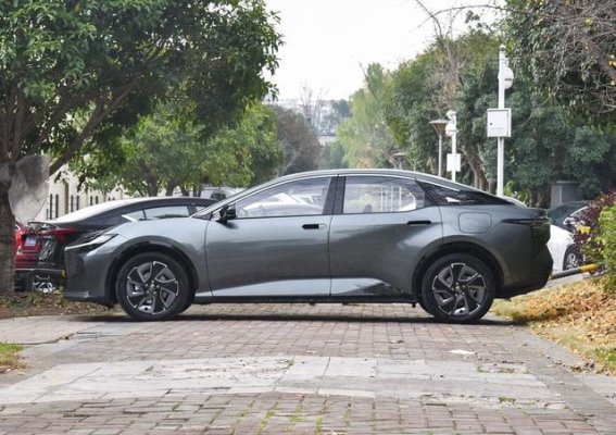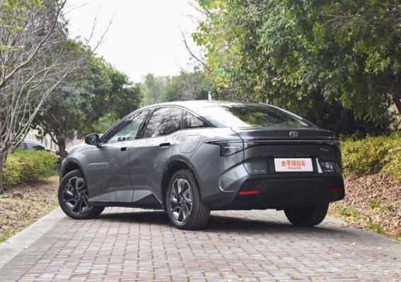 车身侧面线条相对克制,但在细节处理上依然体现出新能源车型的时代特征。溜背式车顶造型让整车姿态更加流畅,配合悬浮式车顶设计,在视觉上有效降低了车身厚重感。隐藏式门把手的加入,不仅有助于优化风阻表现,也进一步强化了整车的科技氛围。侧面比例控制较为均衡,既保证了后排乘坐空间和行李厢实用性,又避免了因造型夸张而带来的使用妥协。这种在造型与功能之间保持理性取舍的设计取向,体现出一汽丰田对家用轿车属性的清晰认知。