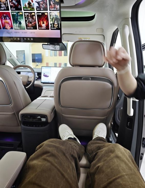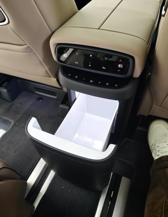 内饰方面,X9增程版延续了小鹏家用豪华风格,浅咖色内饰视觉温暖且高级感十足。不过一些细节设计仍不尽如人意,比如前排空调出风口和音响盖板的密集设计,既容易积灰,也增加了清洁难度。好在功能配置方面非常全面,车机系统响应迅速,UI界面具有小鹏特色,操作流畅直观。后排空调柔风出风设计避免了直吹的不适,顶棚配备可调阅读灯,阻尼感适中,使用体验舒适。后排屏幕收折时仍朝外,需要留意保护;冰箱实现了全电动开关,支持语音控制,这些细节体现了增程版在家用体验上的用心。车顶保留眼镜盒,对于夏季墨镜使用者来说也是贴心设计。