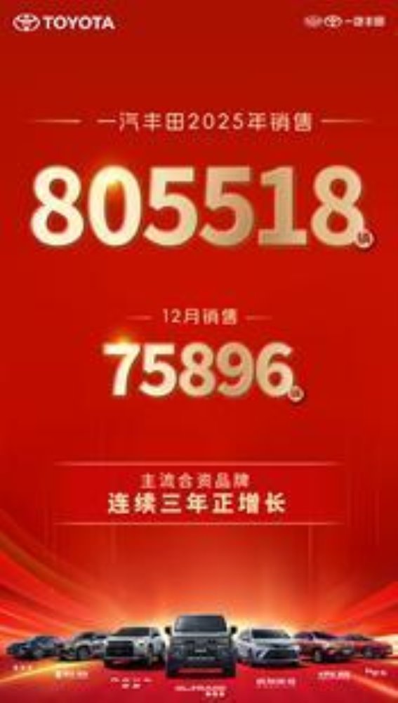 当2026年的第一缕晨光洒向大地,我们回望刚刚过去的2025年,这一年对于一汽丰田而言,是充满机遇与挑战,也是一段深刻蜕变的时期。在复杂多变的市场环境中,一汽丰田以连续三年的正增长稳健姿态,再次证明了其作为主流合资品牌的韧性与活力。全年销量达到805,518辆,这一数字不仅是销量的体现,更折射出品牌在产品布局、技术升级、体系优化和用户价值建设方面的全面跃升。2025年的一汽丰田,不仅延续了稳健增长的势头,更在高端化和电动化的双轮驱动下,完成了结构优化和品牌升级,为迈入智电时代奠定了坚实基础。