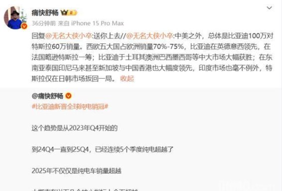 除了销量,比亚迪在多个关键指标上也逐步超越了特斯拉。在2025年,除了纯电汽车销量外,比亚迪在汽车业务营收、毛利率、营业利润以及研发投入等方面,都有望全面领先于特斯拉。尤其是在中美两大市场之外,比亚迪的表现更加突出,尤其是在欧洲、东南亚及其他地区的市场布局,进一步增强了其全球竞争力。