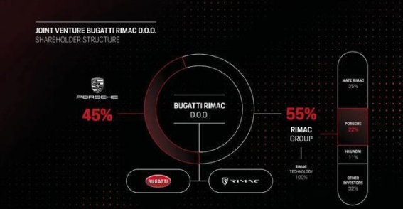 布加迪的股权变动并非一蹴而就。自从大众集团将布加迪出售后,这家超跑品牌的股权一直处于不断的重组和调整之中。2021年,布加迪与克罗地亚豪华电动超跑品牌锐马克完成合并,创立了锐马克集团。在此合并后,锐马克集团的股权结构成为市场关注的焦点:马特·锐马克持有37%的股份,保时捷拥有24%的股份,现代汽车则占有12%,其余的股份由其他投资者持有。合并后的锐马克集团,实际控制了布加迪-锐马克55%的股份,而保时捷则持有剩余的45%。