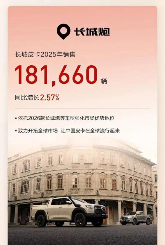 长城的皮卡业务同样表现亮眼,2025年长城皮卡的销量为181660辆,同比增长2.57%。得益于2026款车型的上市,长城皮卡在国内市场的地位进一步稳固,并通过不断扩展海外市场,推动中国皮卡在全球的影响力。随着长城皮卡在全球多个国家和地区的市场份额逐渐增大,长城汽车在皮卡领域的全球化进程进一步加速。