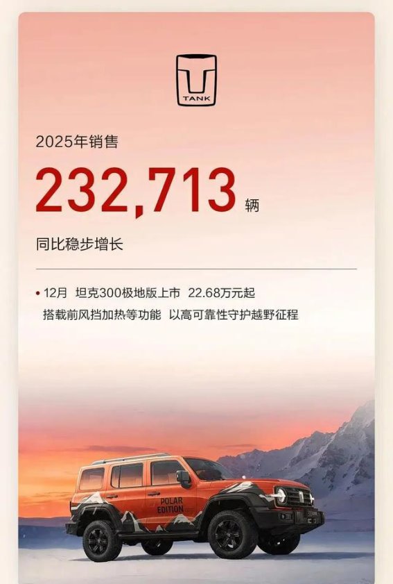 坦克品牌也稳步发展,全年销量为232713辆,保持了平稳的增长趋势。坦克一直以来以其硬派越野车的形象深入人心,尤其是在越野能力和安全性能方面备受消费者青睐。新上市的坦克300极地版,凭借前风挡加热功能,进一步提升了其在极寒环境下的越野能力。这款车型也为消费者提供了更为可靠的越野驾驶体验,使得坦克品牌的市场影响力得到了增强。