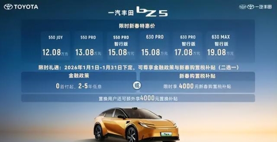 2025年12月31日,一汽丰田正式发布了bZ系列纯电动车的最新价格信息,标志着其在电动出行领域的持续深化与创新。此次发布的bZ3智享家车型,分别推出了JOY版和PRO版,售价为9.38万元和10.38万元。更为优惠的是,凡在2026年1月1日至1月31日期间下定的消费者,均可享受4000元购置税补贴,或可选择灵活的金融方案,例如“0首付、2-5年低息”或“5年贷款,前两年0首付0息,后3年低息”等购车方式。