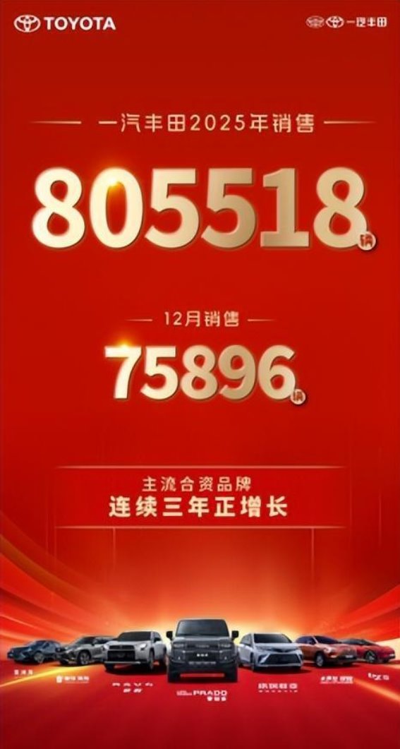 2025年,国内汽车市场竞争日益激烈,消费者对汽车的需求不仅局限于功能性,更向着高端化、智能化、电动化等多元化方向发展。在这样的大环境下,一汽丰田交出了一份亮眼的成绩单。全年新车销量达805518辆,连续三年实现正增长,稳步保持着主流合资品牌的竞争力。通过优化产品结构和完善产品矩阵,一汽丰田不仅巩固了其市场地位,更逐步推进了高端化与电动化的转型步伐。