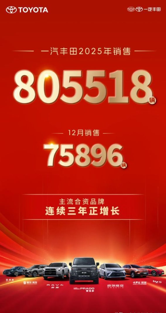 回望2025年,一汽丰田迎来了前所未有的发展机遇。在这一年里,面对全球汽车市场的激烈竞争与复杂环境,丰田稳步推进战略布局,取得了骄人的成绩。全年销售新车805518辆,持续三年实现正增长,这一数字不仅代表了丰田品牌在中国市场的稳固根基,也标志着其在主流合资车企中的竞争力不断攀升。特别是在高端车型及智能电动化领域,丰田通过精准的市场定位和创新的技术,进一步巩固了市场份额。