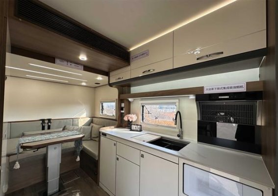 厨房区设计为瓦纳卡豪沃悍将Pro房车的亮点之一,配备了完整的烹饪设施。车内有20L小米平板式微波炉、大功率下排式集成吸油烟机、230L双开门风冷冰箱等,满足日常烹饪需求。定制岩板台下盆厨台与折叠延长板的搭配,为车主提供了充足的烹饪空间。车内的照明系统也十分周到,独立控制的型材照明灯为烹饪提供了清晰的照明。