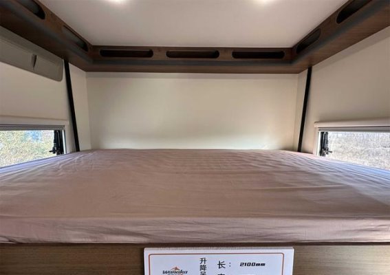 瓦纳卡豪沃悍将Pro房车的睡卧区在舒适性和私密性方面也下足了功夫。额头床尺寸为2230×1480mm,配备了独立照明灯、氛围灯带及透气床垫,确保舒适的睡眠环境。后横床为2230×1350mm,采用镂空床板与铝型材支架设计,支撑性更强。后床还配备了电动升降功能和隐私帘,增强了使用的便捷性和私密性。车内的卡座餐桌还可降下拼成临时床位,增加了车内的睡眠容量。