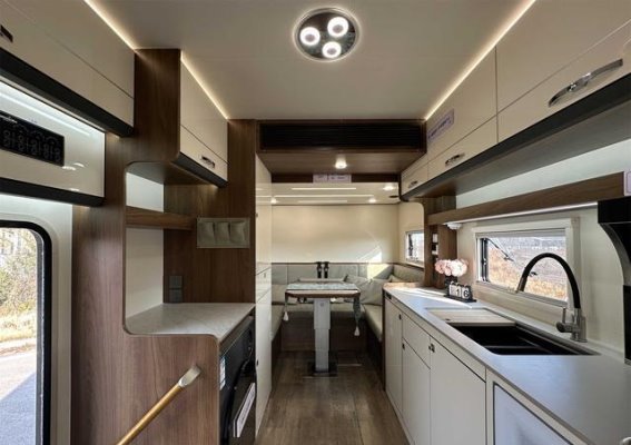 走进车内,米白与浅木色的内饰色调搭配温馨的暖光,瞬间营造出家的氛围。车内空间宽敞,布局设计巧妙,每一寸空间都得到了最大程度的利用。生活区采用了经典的后横床对卡座布局,整体工艺精致,细节之处尽显品质。驾驶室与生活区采用贯通设计,配备了瓦纳卡专利的隐藏式折叠踏步,方便上下床,提升了车内的使用便捷性。