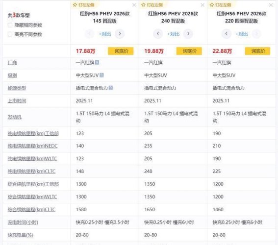 红旗HS6 PHEV的价格定位极具亲和力,区间为17.88万至22.88万,涵盖了三款配置版本。无论是入门版145智混版,还是中配240智混版和顶配220四驱智混版,都在合理的预算内为消费者提供了出色的性价比。作为一款中大型SUV,红旗HS6 PHEV在尺寸和空间上明显优于紧凑型和中型SUV,能够更好地满足家庭成员的出行需求。结合红旗提供的多项购车福利,这款车为更多家庭用户打开了选择大空间插混SUV的大门。