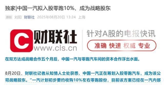 2025年,我还对一汽与零跑的股权合作做出了一项准确的预测。2025年8月28日,财联社报道说一汽可能会收购10%的零跑股份,尽管双方否认了这一消息,但我预测股权投资很可能会发生,只是10%的比例过高,5%左右才更为合理。12月29日,一汽以37.44亿元收购了零跑5%的股份,这一预测得到了证实。