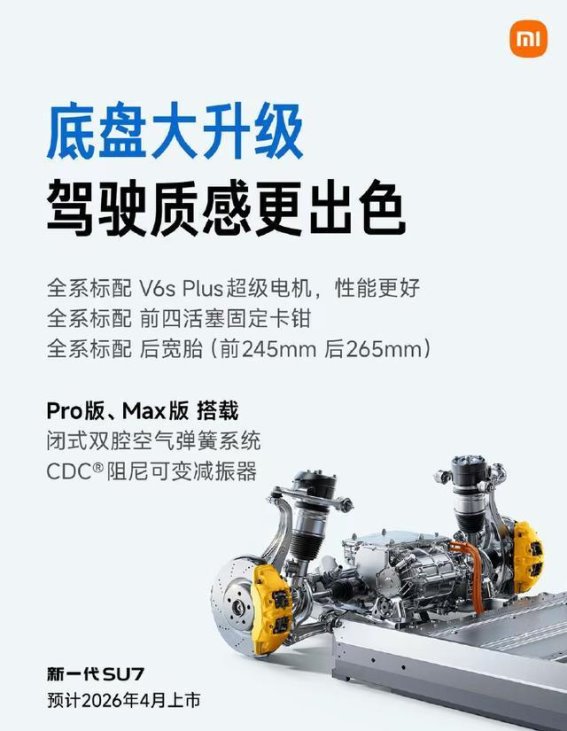新一代小米SU7的配置升级同样值得关注。新车将激光雷达、9安全气囊、700TOPS辅助驾驶算力和4D毫米波雷达等高端技术作为全系标配,入门版用户也能享受到高阶智能驾驶体验。前四活塞固定式刹车卡钳的标配大大提升了行车安全性。而Pro版和Max版车型还额外搭载了闭式双腔空气弹簧系统与CDC阻尼可变减振器,为操控性与舒适性提供了更高的平衡。