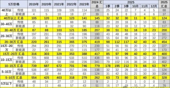 乘联分会秘书长崔东树指出,2025年车市价格变化的根本原因在于车型销售结构的调整。过去几年,市场上高端车型的占比不断上升,尤其是在新能源领域,30万元以上的车型一度成为市场的主力。2024年开始,这一趋势发生了逆转。数据显示,售价在30万元至40万元之间的车型市场份额有所下滑,售价超过40万元的车型市场份额也出现了明显下降。相比之下,5万元以下和5万元至10万元区间的车型市场份额则出现增长,显示出低端车型的需求回升。